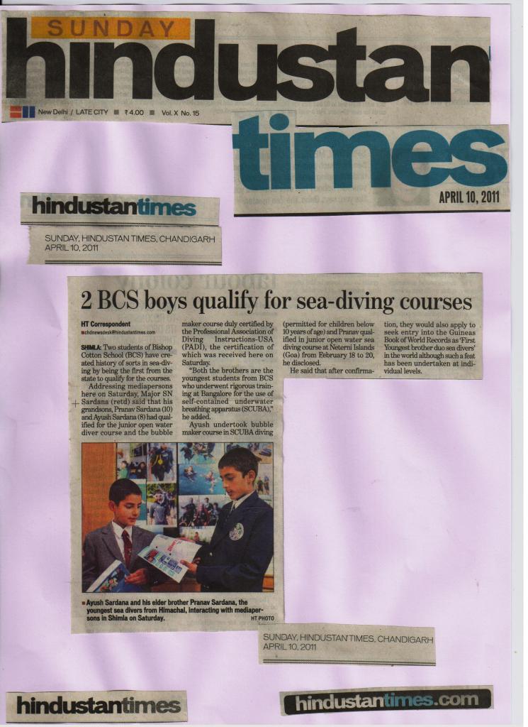 Pranav Sardana, 10 and his brother Ayush, 8, both students of Bishop Cotton School, Shimla, [their mother is a Sky Diver and jumped for BCS for the 150th] have created history by qualifying for the junior open water diver course and bubblemaker course respectively. Pranav is the youngest boy from Himachal to obtain the license from Professional Association of Diving Instructors (PADI), USA, a premier diver training organization. He has the license to perform diving in sea anywhere in the world, whereas Ayush has learnt the art of bubblemaker in diving.