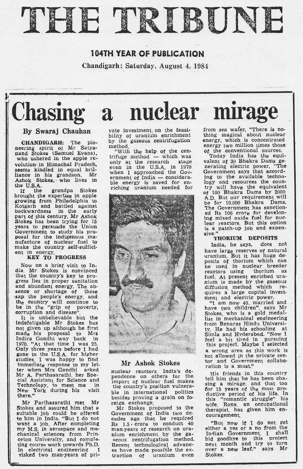 I had proposed to the Government of India for providing nuclear fuel two times in 1970 and 1985. Enclosed is a 1984 article from The Tribune, Chandigarh. Both my attempts were unsuccessful and I gave up on this good idea.