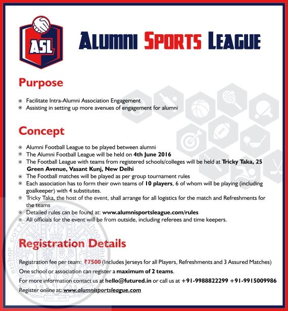 Alumni Sports League begins with the Alumni Football League (6 a side football on turf) which will be hosted in New Delhi on Saturday, 4th June. This event is being organized by FuturEd & Tricky Taka.