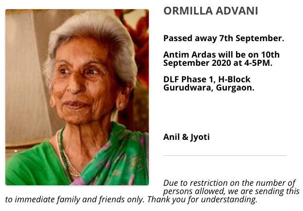 May God bless Mrs.Ormilla Advani’s soul and give Anil and Nita and family courage and strength.