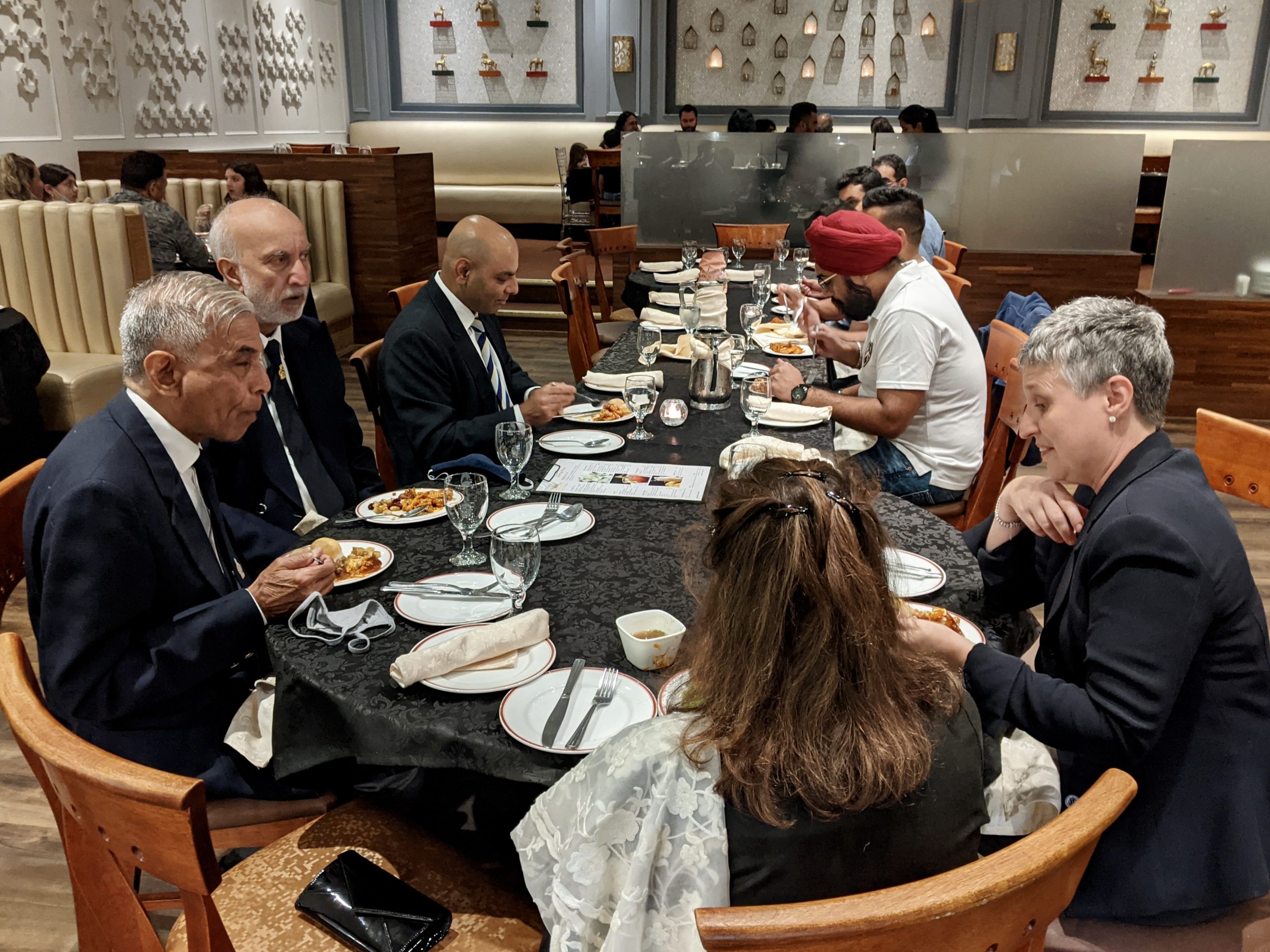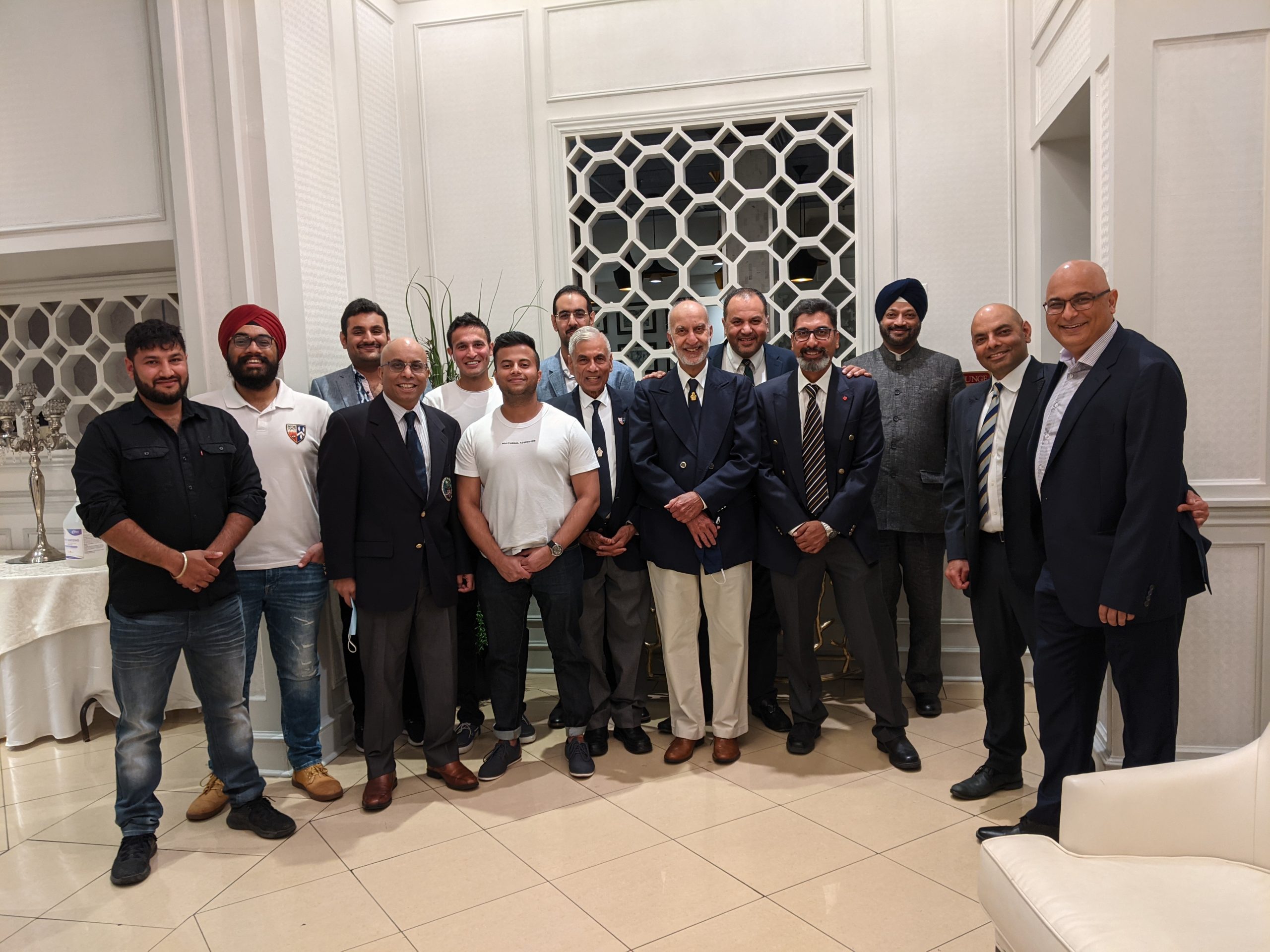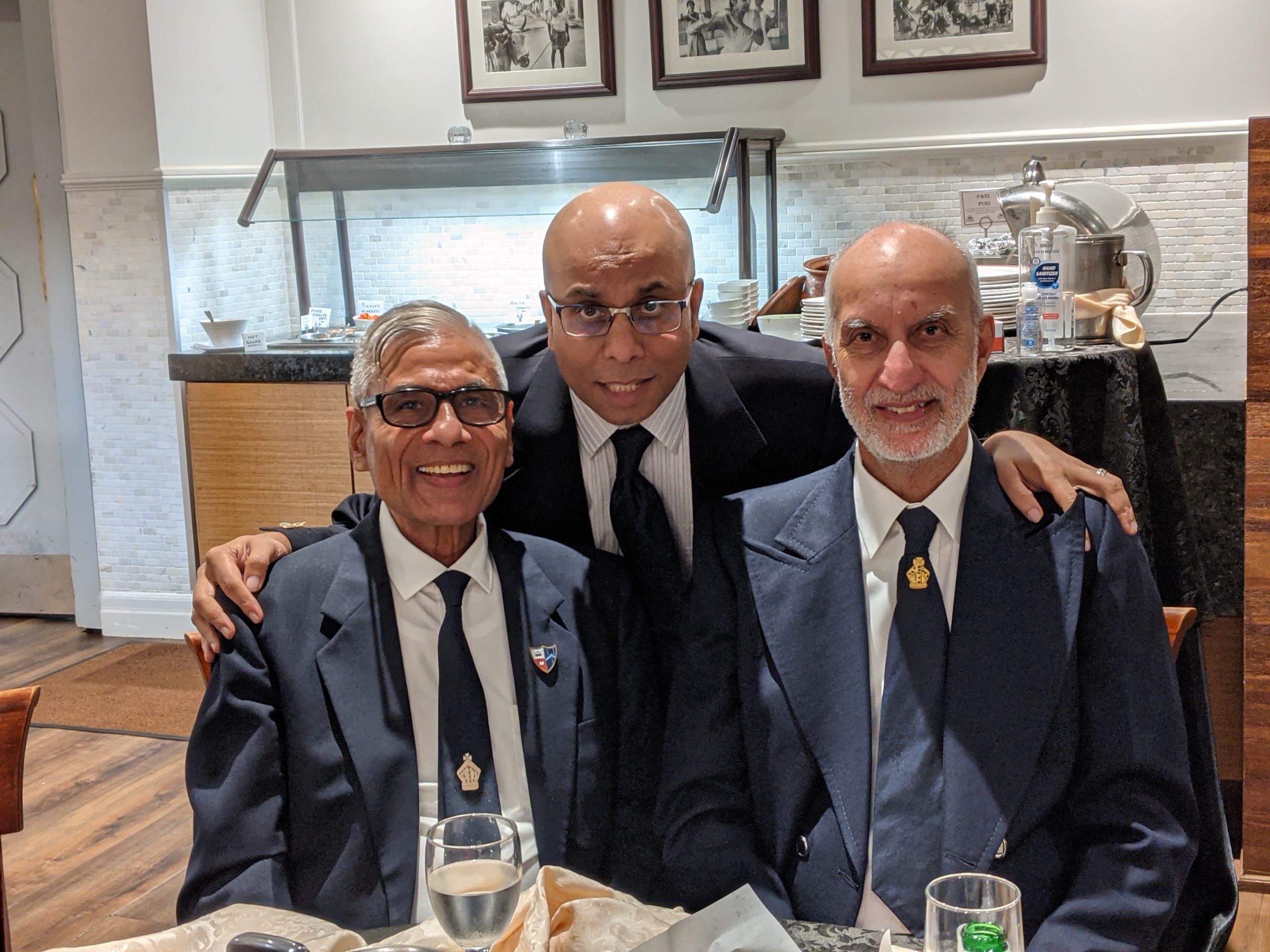 The get-together wasn’t “stag” …the photos show many of the spouses and partners who attended! The listing of names is pretty clear for the group photo…in sequence Left to Right. Jeevan Goyal is in the middle of the photo. Blazer, tie, white shirt. Not bald!