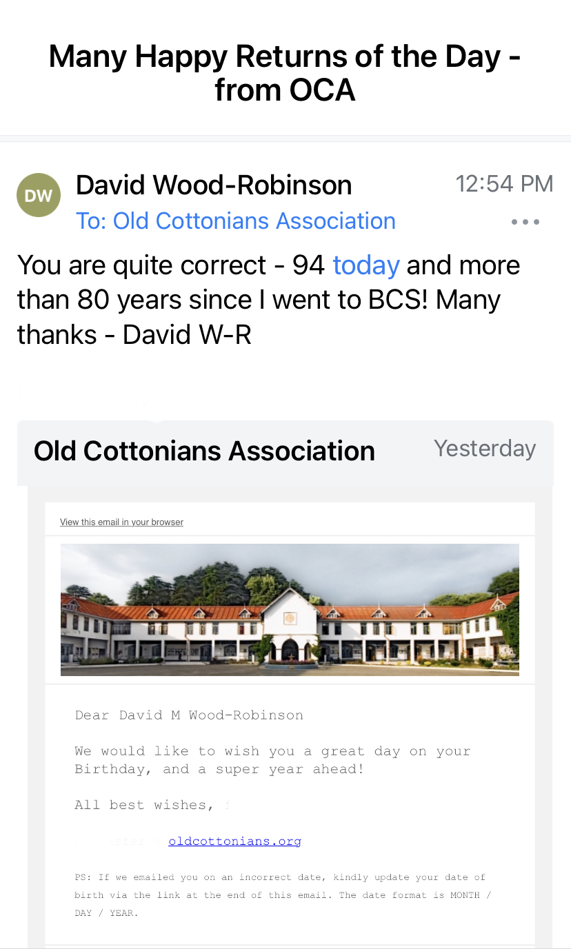 Our very special Old Cottonian Mr. David Wood-Robinson is 94 years young today the 29th September 2022. We wish him many many happy returns and all best wishes for a super-duper day today and many more to come.