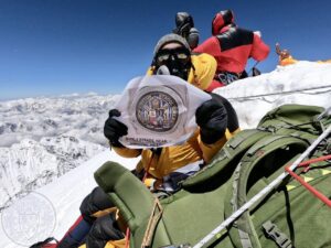 Karma Tenzing [Curzon House Prefect ‘97] with the BCS flag on the summit of Mount Everest at 1:05pm on May 15 2019. “Overcome Evil With